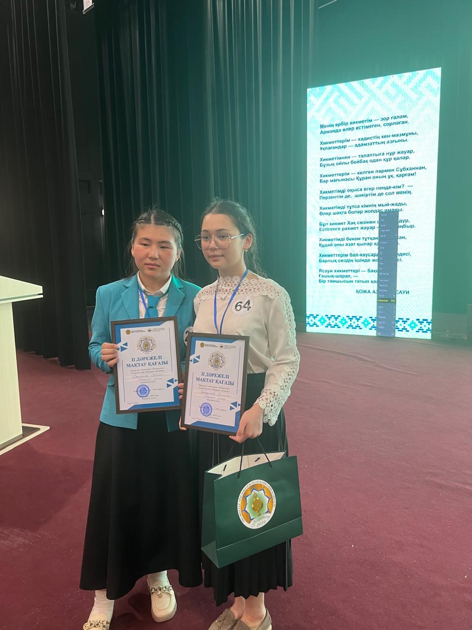 Республикалық Түркістан қаласында өткен "Яссауитану -2024" байқауында 10 "Ә" сынып оқушысы Бахадирова Шахсанам республика бойынша жүлделі ІІ орын иеленіп мг, қала, облыс абыройын қорғап шықты