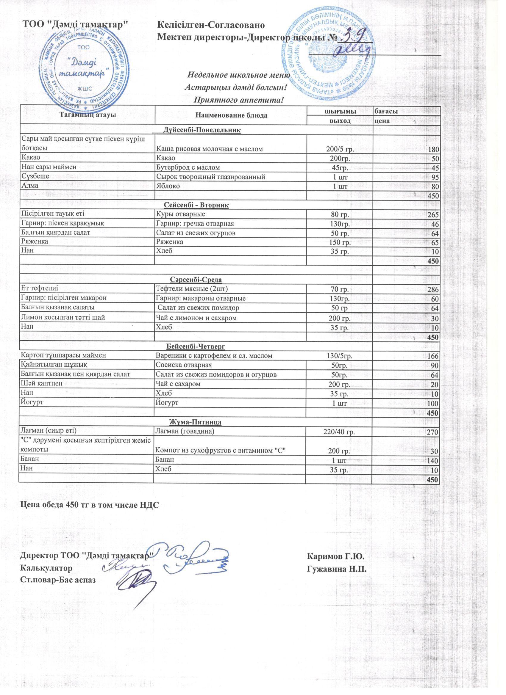 Недельное школьное меню » Жамбыл облысы Тараз қаласы білім бөлімінің "И.В. Панфилов атындағы №39 мектеп - гимназия» мемлекеттік коммуналдық мекемесі