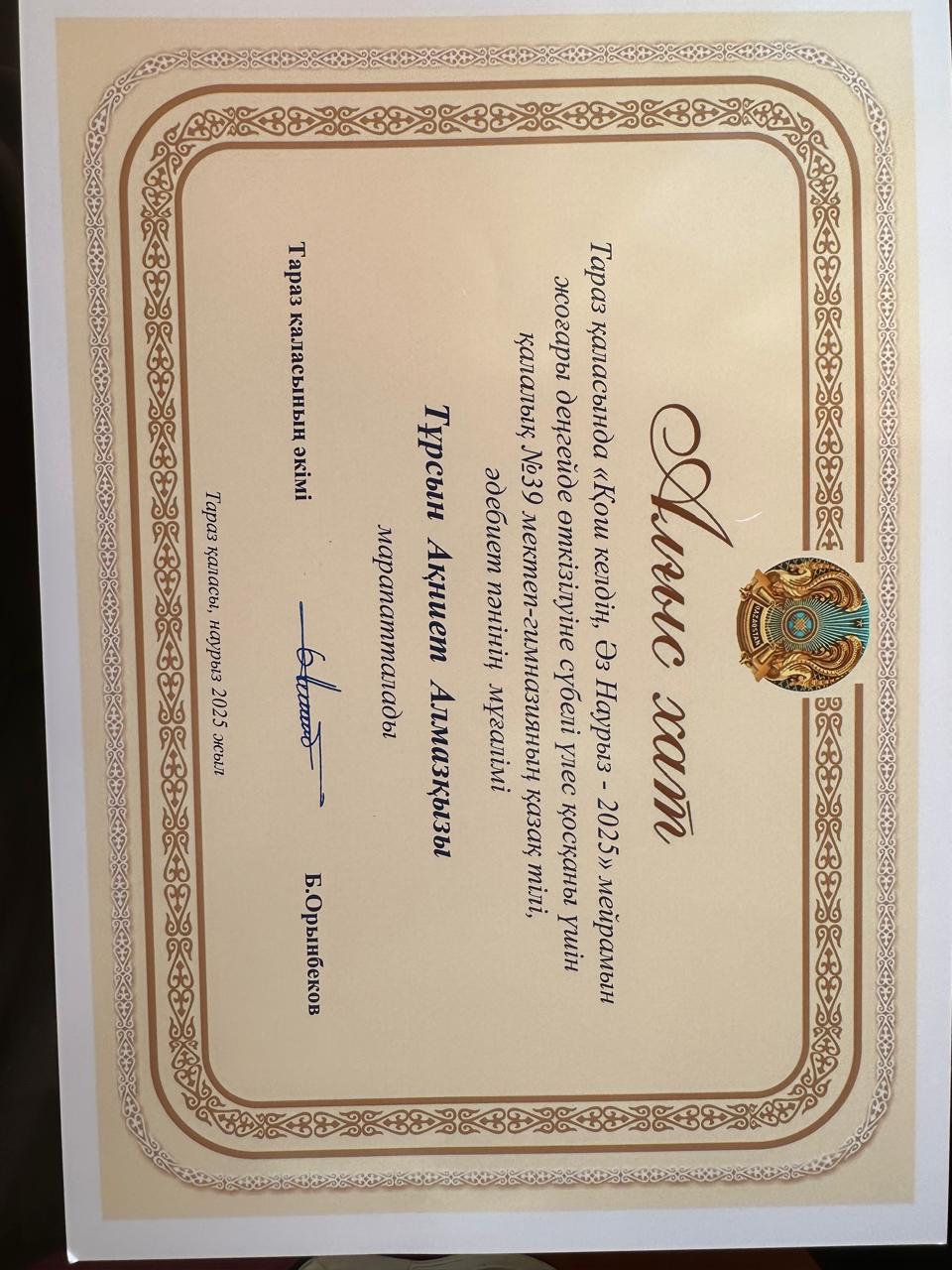 13 май 2025 0 1 2 3 4 5 “Әз Наурыз-2025” Қалалық “Әз Наурыз-2025” мейрамын жоғары деңгейде өткізілуіне үлес қосқаны үшін “Театр” үйірмесі жетекшісі Тұрсын Ақниет Алмазқызы Тараз қаласы әкімінің Алғыс хатымен марапатталды