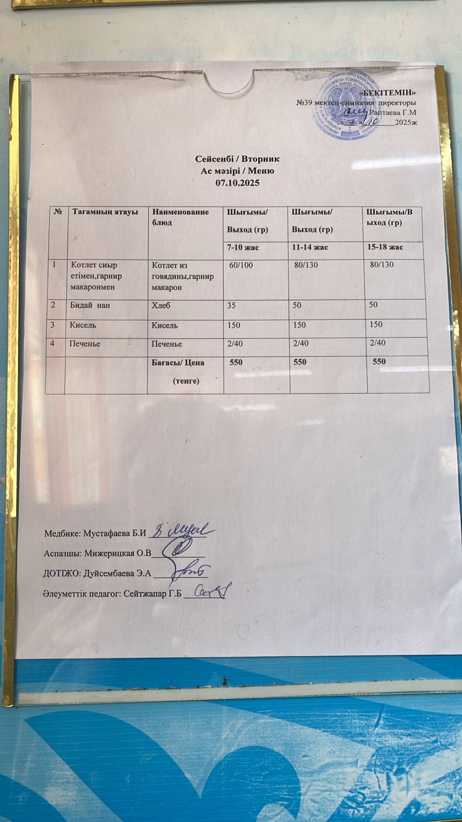 Күнделікті ас мәзірі » Жамбыл облысы Тараз қаласы білім бөлімінің "И.В. Панфилов атындағы №39 мектеп - гимназия» мемлекеттік коммуналдық мекемесі