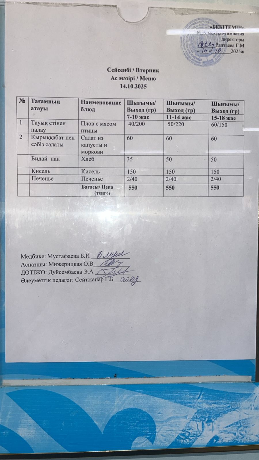Күнделікті ас мәзірі » Жамбыл облысы Тараз қаласы білім бөлімінің "И.В. Панфилов атындағы №39 мектеп - гимназия» мемлекеттік коммуналдық мекемесі