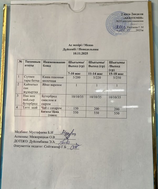 Күнделікті ас мәзірі » Жамбыл облысы Тараз қаласы білім бөлімінің "И.В. Панфилов атындағы №39 мектеп - гимназия» мемлекеттік коммуналдық мекемесі