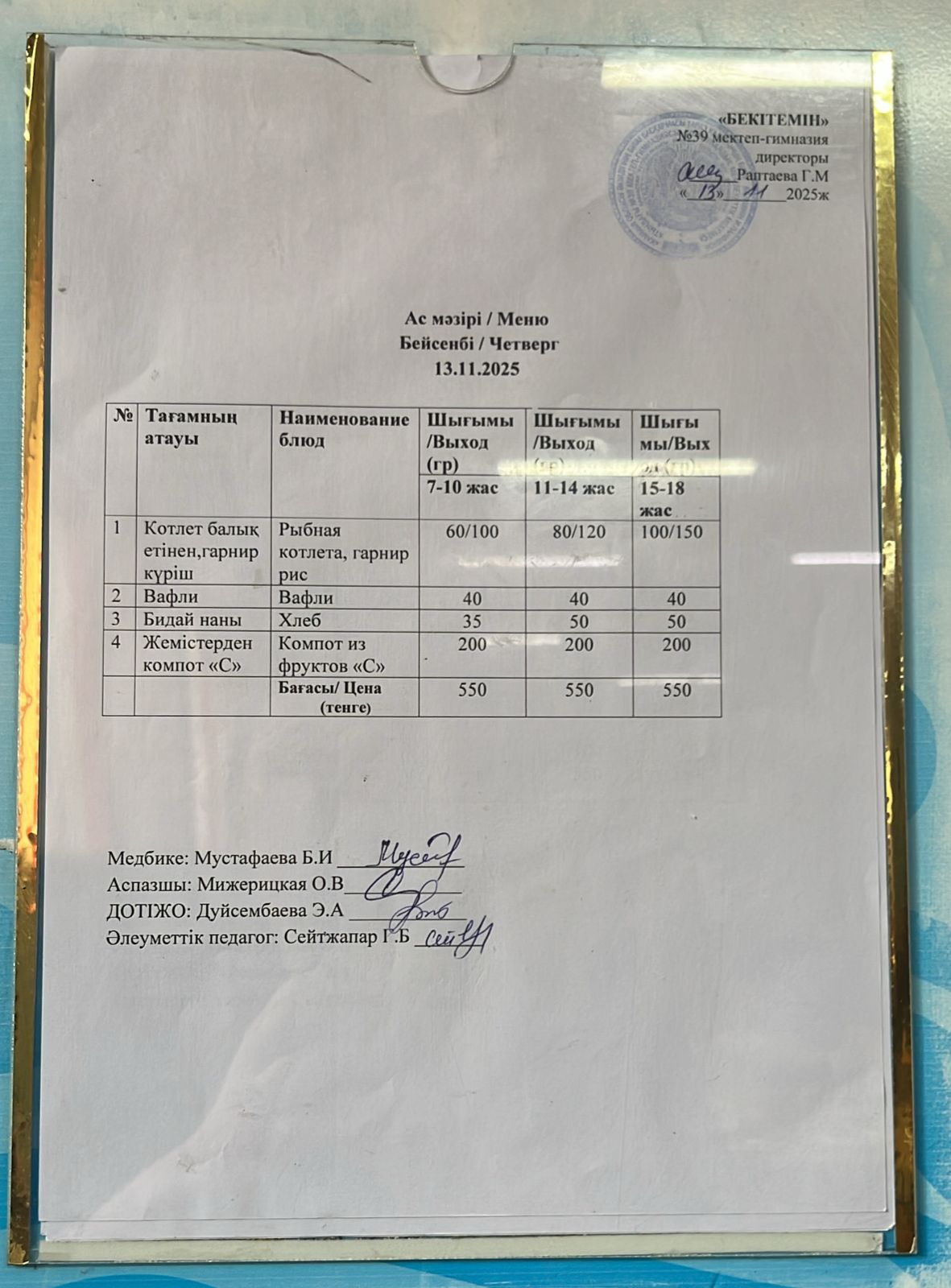 Күнделікті ас мәзәрі » Жамбыл облысы Тараз қаласы білім бөлімінің "И.В. Панфилов атындағы №39 мектеп - гимназия» мемлекеттік коммуналдық мекемесі