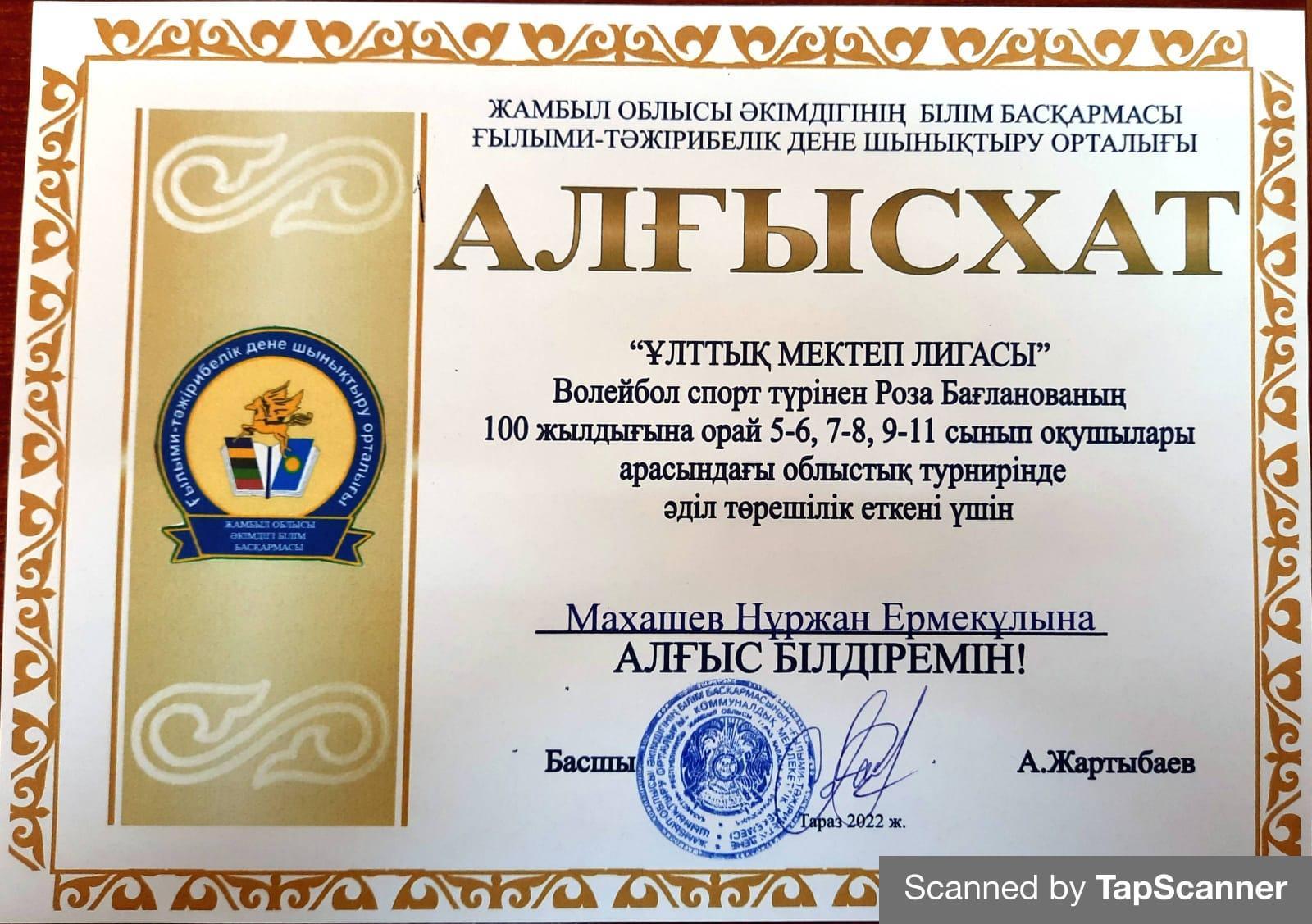 Махашев Нуржан әріптесіміз Жамбыл облысы әкімдігінің білім басқармасы ғылыми-әдістемелік дене шынықтыру орталығының ұйымдастыруымен өткен "ҰЛТТЫҚ МЕКТЕП ЛИГАСЫ" байқауында әділ төрелік жасағаны үшін орталық басшысының Алғыс хатымен марапатталды !