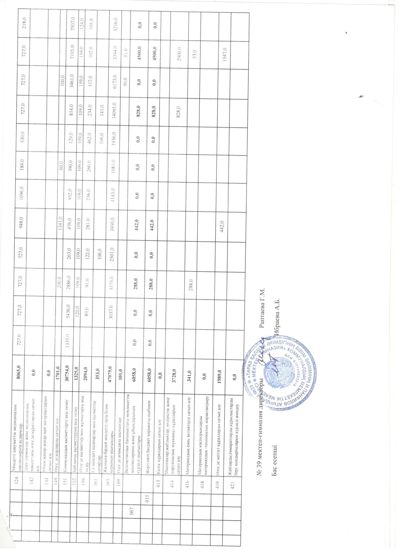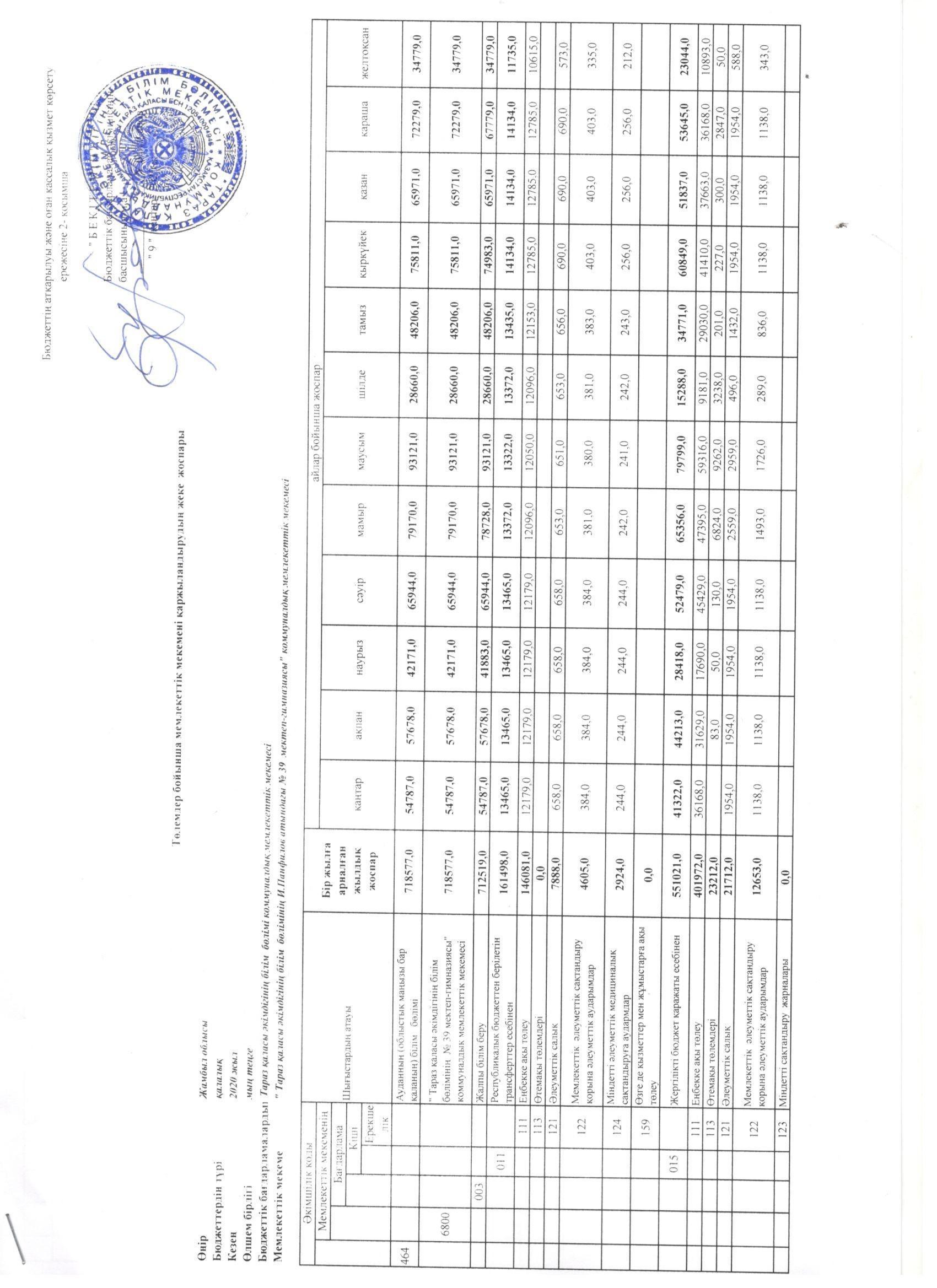 Төлемдер бойынша мемлекеттік мекемені қаржыландырандырудың жеке жоспары » Жамбыл облысы Тараз қаласы білім бөлімінің "И.В. Панфилов атындағы №39 мектеп - гимназия» мемлекеттік коммуналдық мекемесі