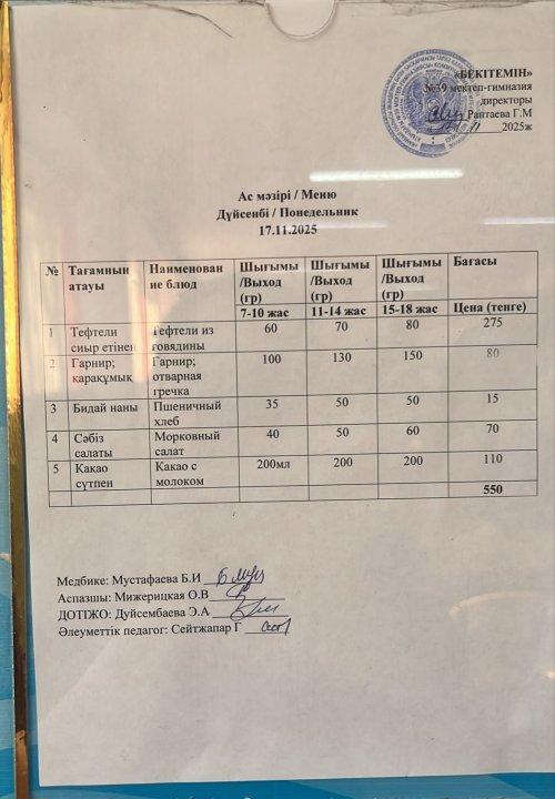 Күнделікті ас мәзәрі » Жамбыл облысы Тараз қаласы білім бөлімінің "И.В. Панфилов атындағы №39 мектеп - гимназия» мемлекеттік коммуналдық мекемесі