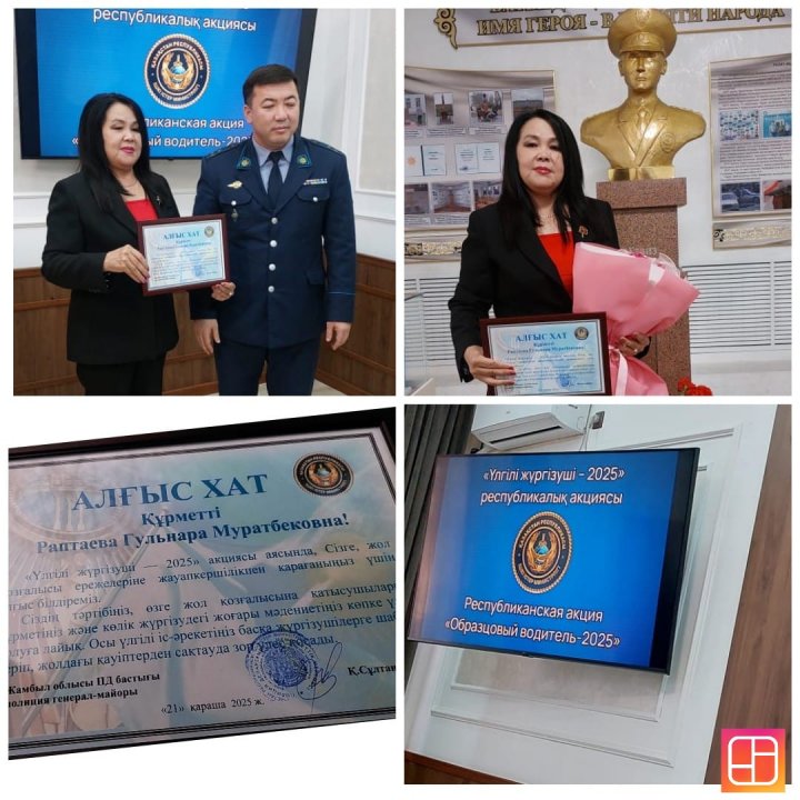 «Үлгілі жүргізуші-2025» акциясы аясында жол қозғалысы ережелеріне жауапкершілікпен қарағаны үшін және мектеп оқушыларына жол қозғалысы ережелерін жетік меңгерткені үшін Жамбыл облысы ішкі істер департаментінің атынан мектеп-гимназиямыздың директоры Раптаева Гульнара Муратбековна Алғыс хатпен марапатталды.