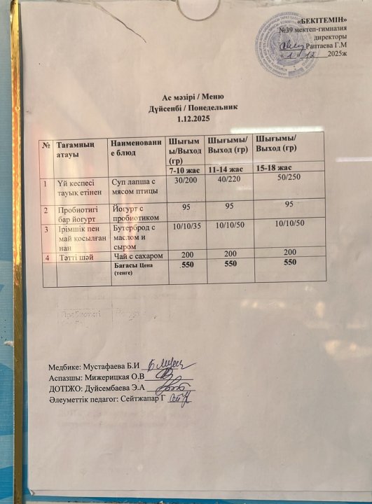 Күнделікті ас мәзірі » Жамбыл облысы Тараз қаласы білім бөлімінің "И.В. Панфилов атындағы №39 мектеп - гимназия» мемлекеттік коммуналдық мекемесі