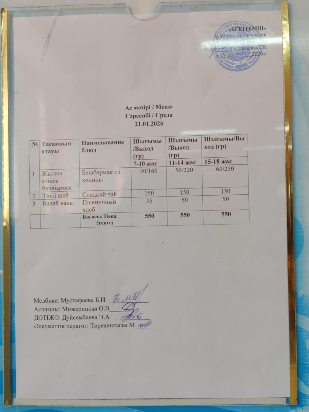 Күнделікті ас мәзірі » Жамбыл облысы Тараз қаласы білім бөлімінің "И.В. Панфилов атындағы №39 мектеп - гимназия» мемлекеттік коммуналдық мекемесі