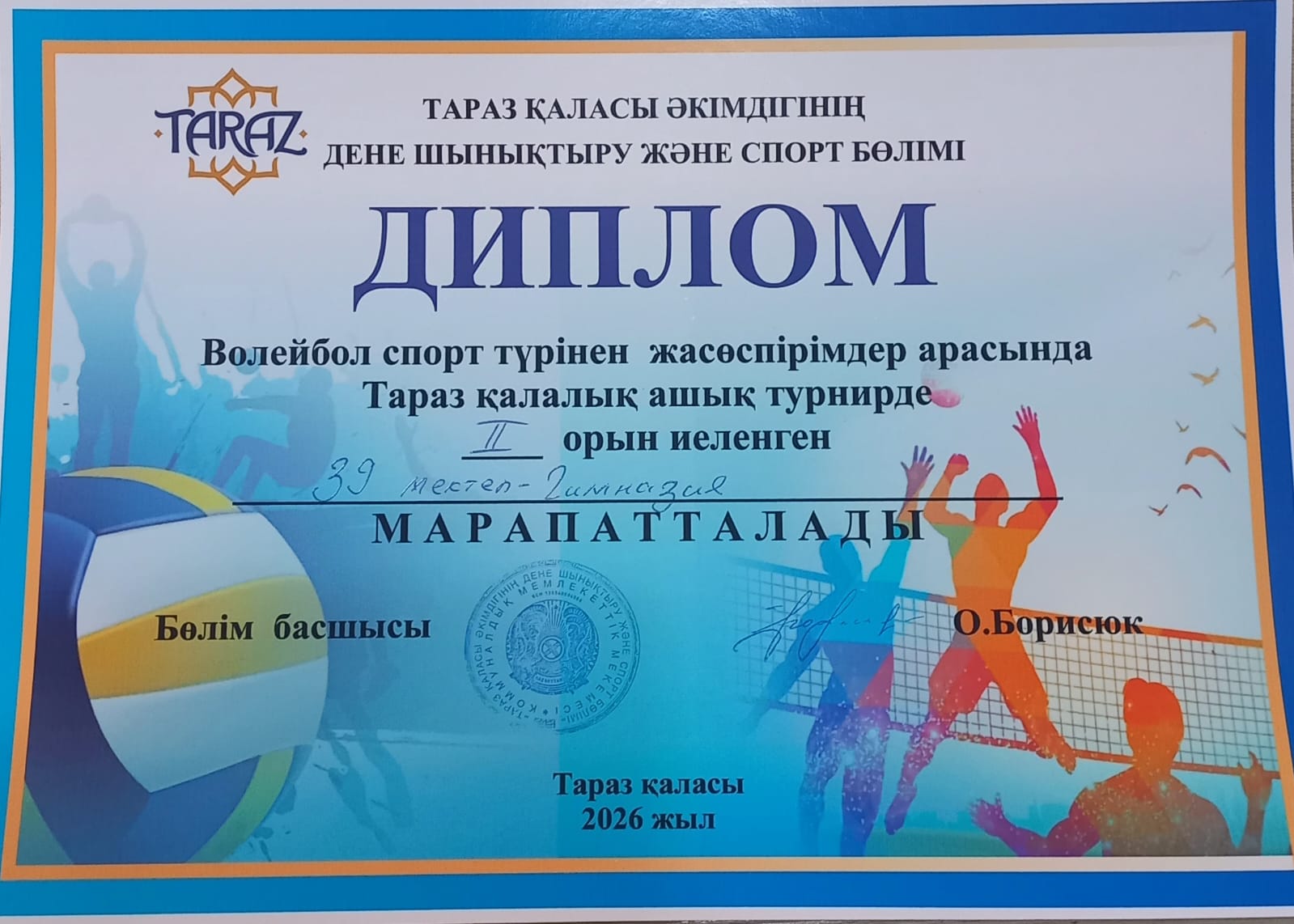 Турнирге 8 команда қатысып 39 мектеп- гимназиясының қыздар волейбол командасы жүлделі-II орын иеленді.