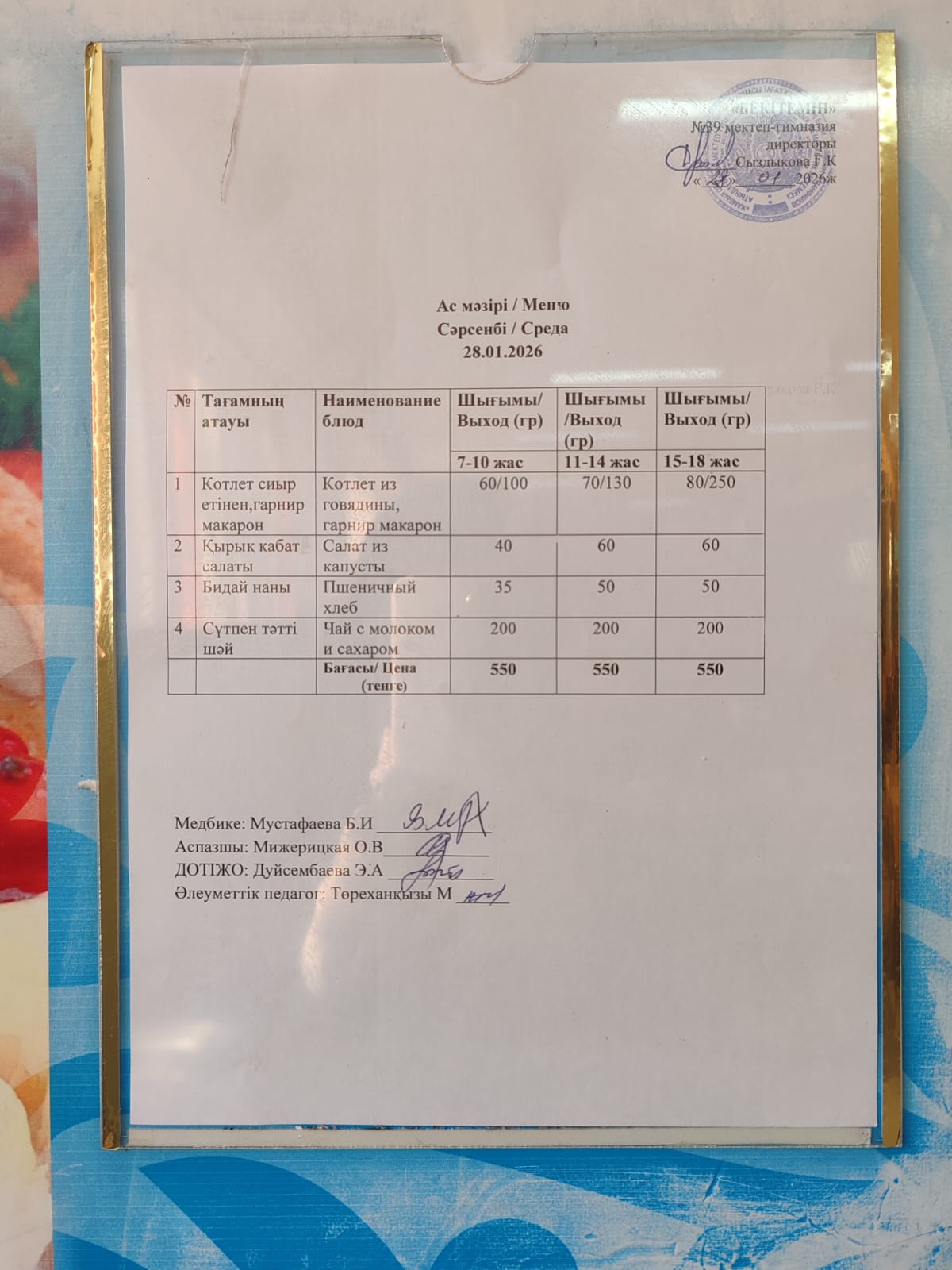 Күнделікті ас мәзірі » Жамбыл облысы Тараз қаласы білім бөлімінің "И.В. Панфилов атындағы №39 мектеп - гимназия» мемлекеттік коммуналдық мекемесі