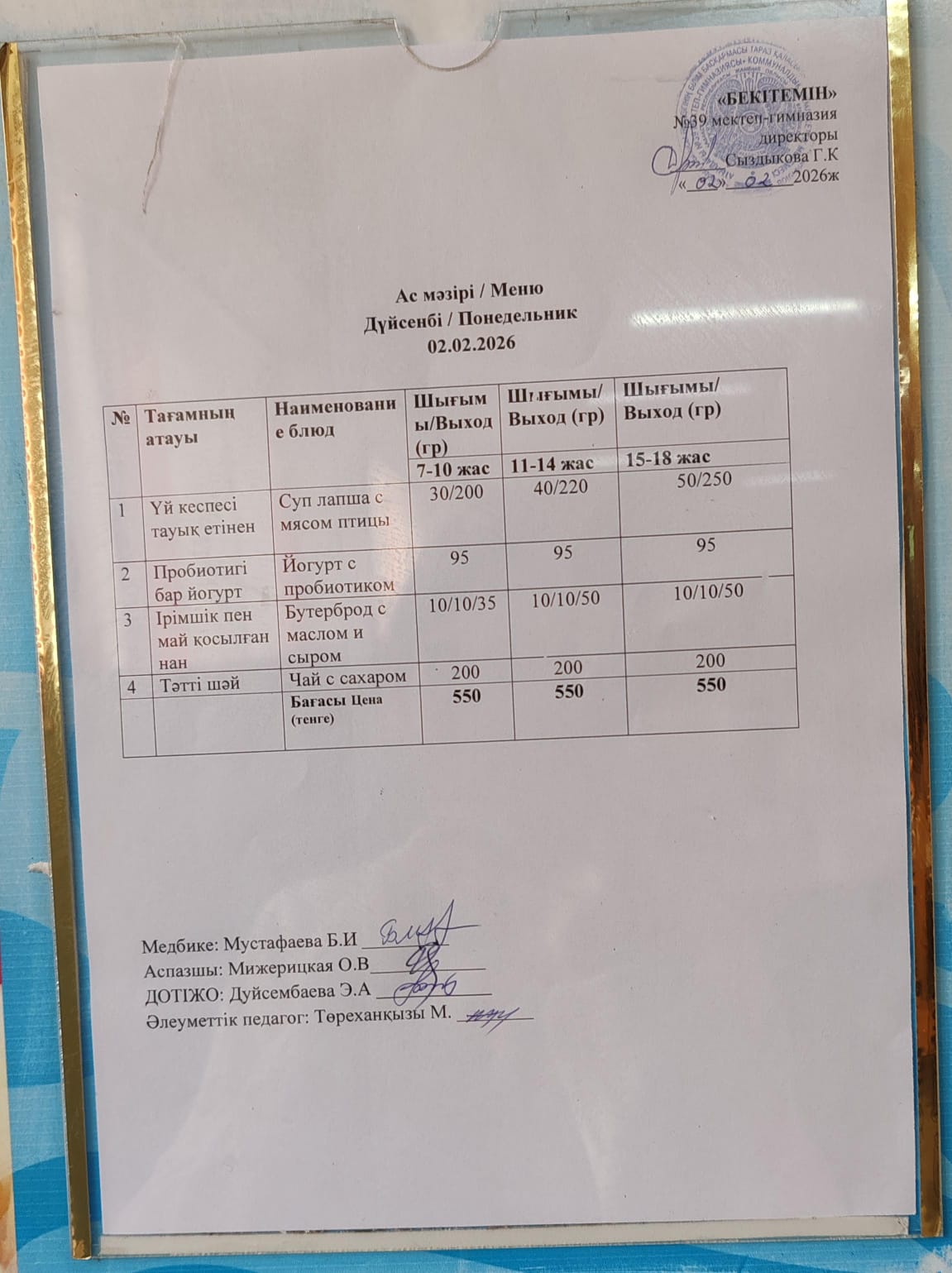 Күнделікті ас мәзірі » Жамбыл облысы Тараз қаласы білім бөлімінің "И.В. Панфилов атындағы №39 мектеп - гимназия» мемлекеттік коммуналдық мекемесі