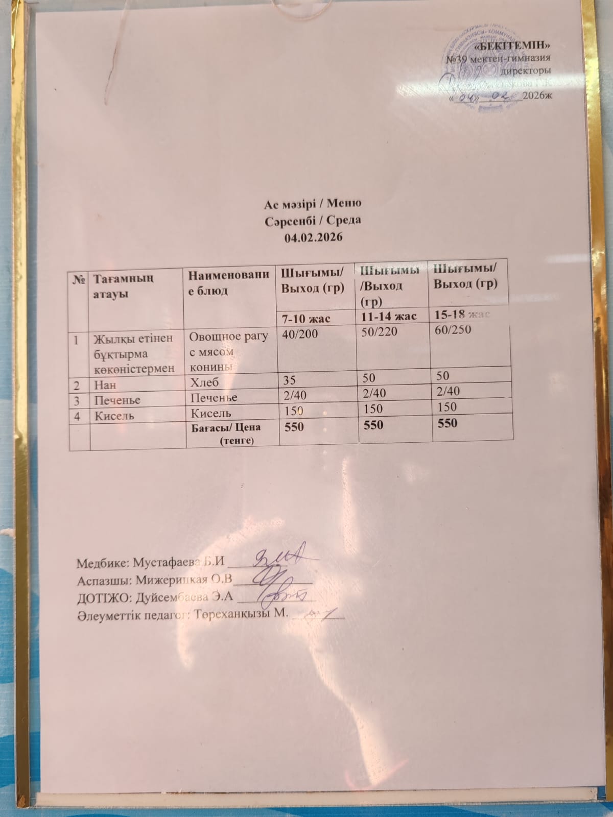 Күнделікті ас мәзірі » Жамбыл облысы Тараз қаласы білім бөлімінің "И.В. Панфилов атындағы №39 мектеп - гимназия» мемлекеттік коммуналдық мекемесі