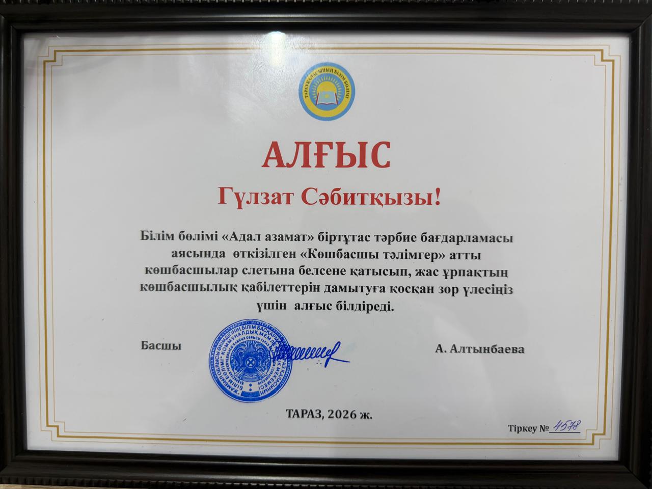көшбасшылық қабілеттерін дамытуға қосқан зор үлесі үшін Қаржаубаева Гүлзат Сабитқызы қалалық білім бөлімі басшысының Алғыс хатымен марапатталды.Құттықтаймыз!Тек биіктен көрініңіз
