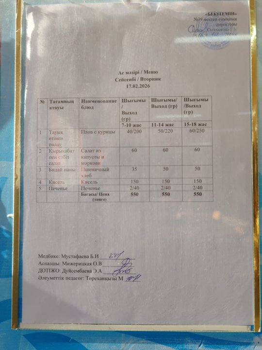 Күнделікті ас мәзірі » Жамбыл облысы Тараз қаласы білім бөлімінің "И.В. Панфилов атындағы №39 мектеп - гимназия» мемлекеттік коммуналдық мекемесі