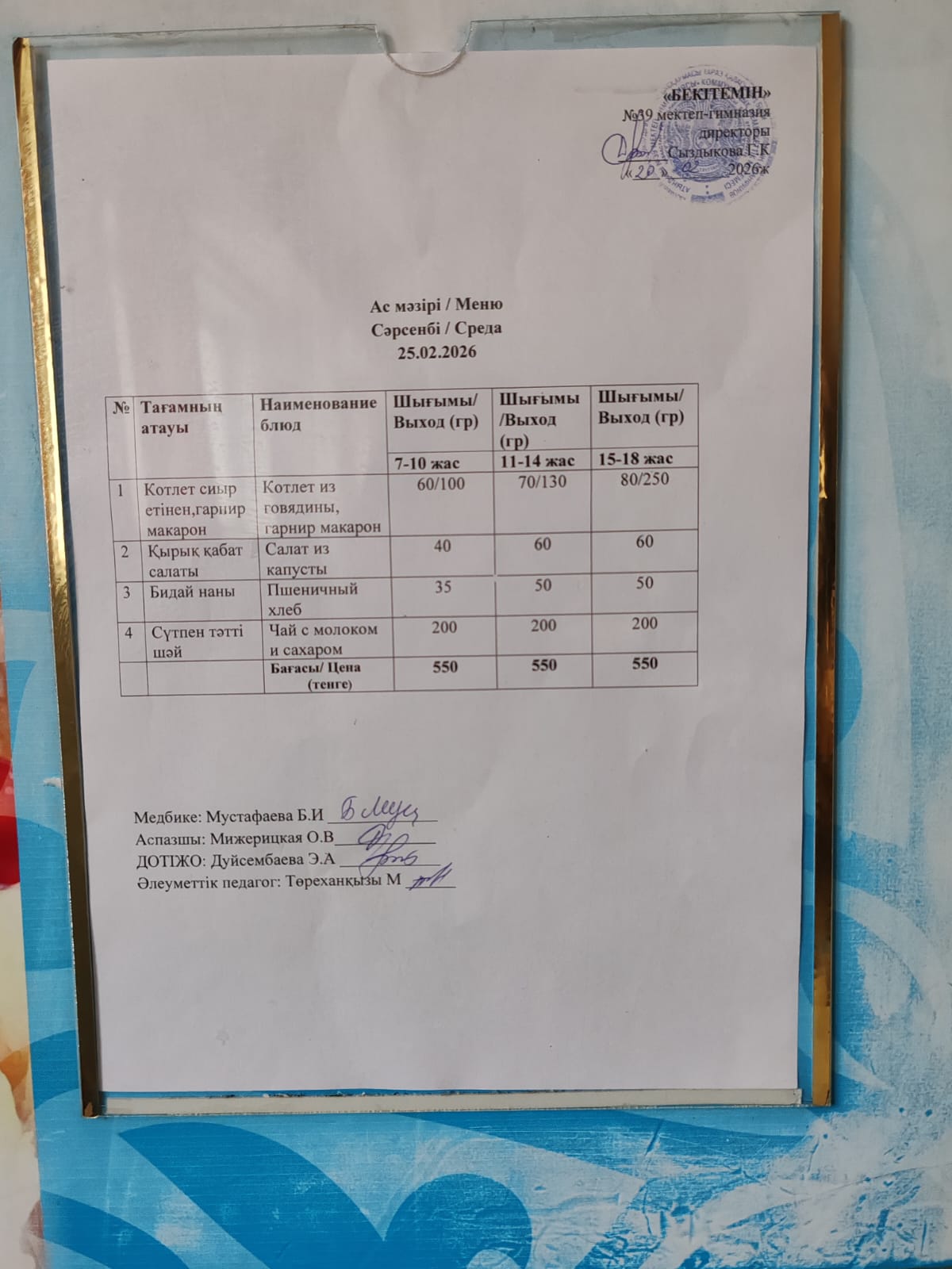 Күнделікті ас мәзірі » Жамбыл облысы Тараз қаласы білім бөлімінің "И.В. Панфилов атындағы №39 мектеп - гимназия» мемлекеттік коммуналдық мекемесі