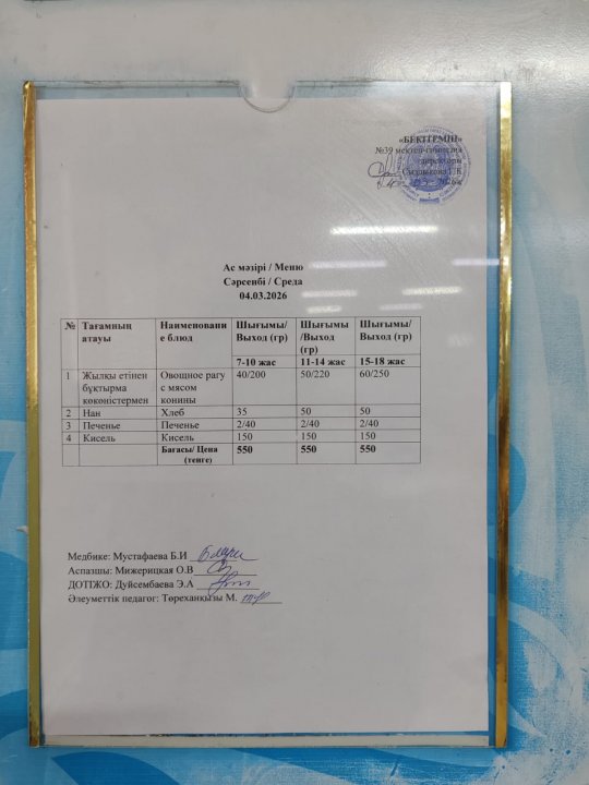 Күнделікті ас мәзірі » Жамбыл облысы Тараз қаласы білім бөлімінің "И.В. Панфилов атындағы №39 мектеп - гимназия» мемлекеттік коммуналдық мекемесі