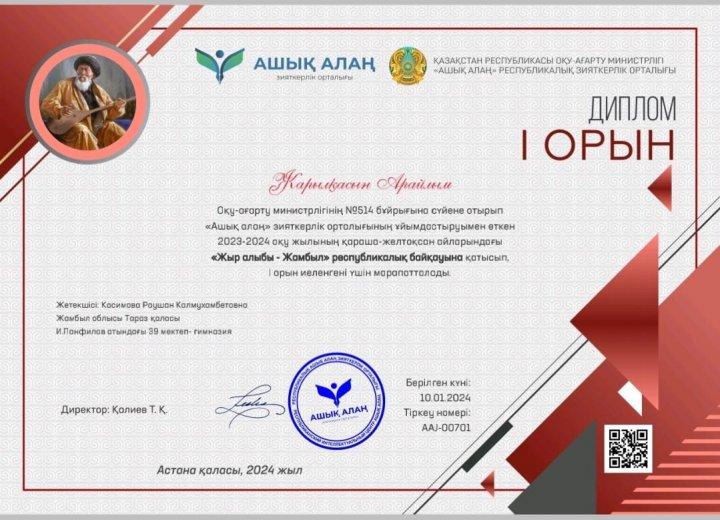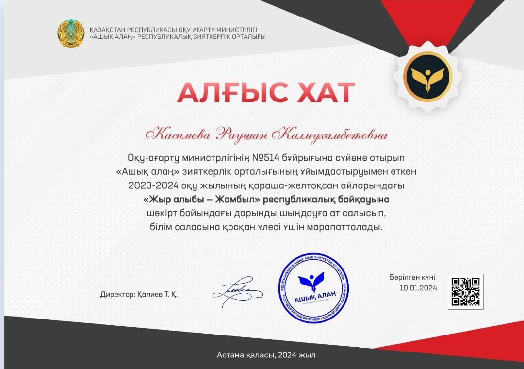 13 январь 2024 0 1 2 3 4 5 Қазақ сыныптарындағы қазақ тілі мен әдебиеті пәнінің педагог-зерттеуші маманы Раушан Касимованың жетістіктері Қазақ сыныптарындағы қазақ тілі мен әдебиеті пәнінің педагог-зерттеуші маманы Раушан Касимованың жетістіктері