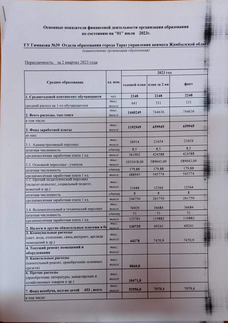 Основные показатели финансовой деятельности организации образования » Жамбыл облысы Тараз қаласы білім бөлімінің "И.В. Панфилов атындағы №39 мектеп - гимназия» мемлекеттік коммуналдық мекемесі
