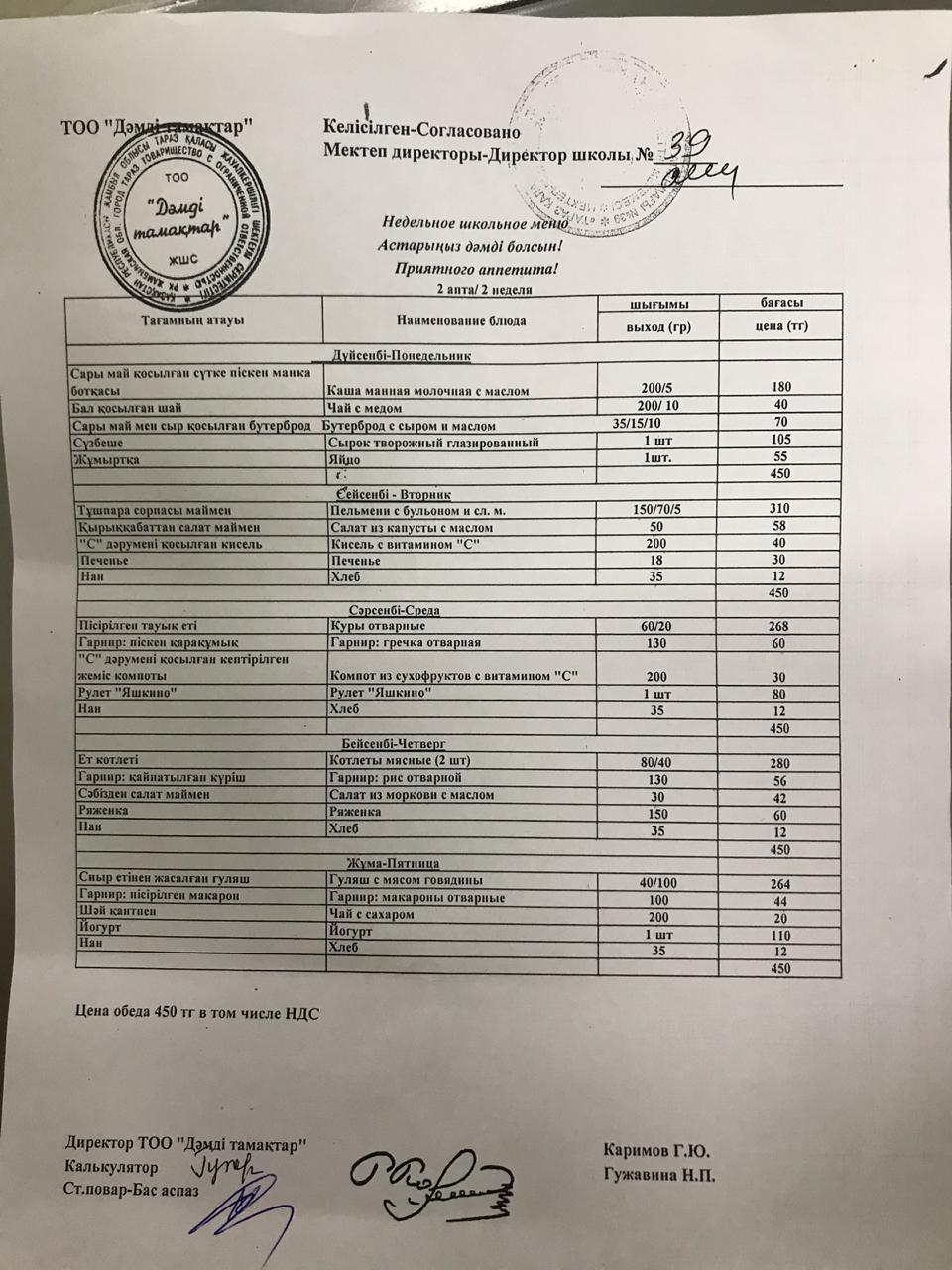 Недельное школьное меню » Жамбыл облысы Тараз қаласы білім бөлімінің "И.В. Панфилов атындағы №39 мектеп - гимназия» мемлекеттік коммуналдық мекемесі