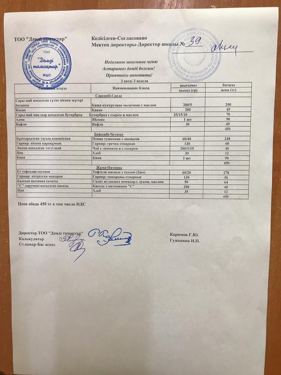 Недельное школьное меню » Жамбыл облысы Тараз қаласы білім бөлімінің "И.В. Панфилов атындағы №39 мектеп - гимназия» мемлекеттік коммуналдық мекемесі